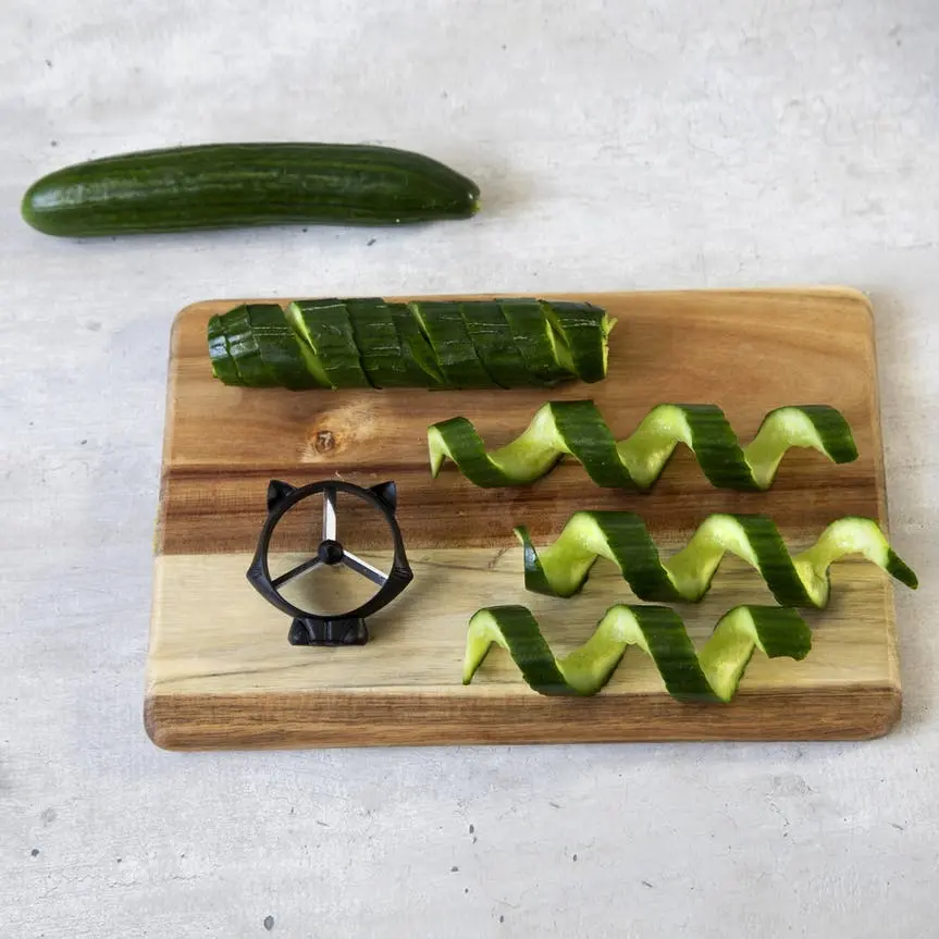 Créez des boucles de légumes pour garnir vos assiettes tel un top chef ! Tournez vos carottes concombres, courgettes …. à travers les lames de Curly Cat et hop la magie opère ! Egalement à mettre dans vos bouteilles d’eau pour aromatiser !