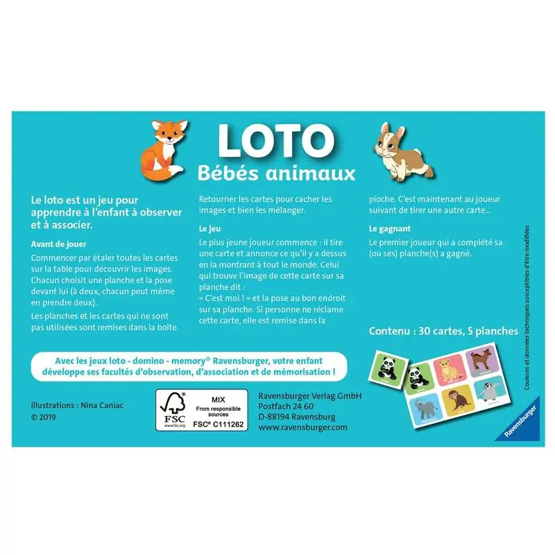 Le classique loto ! Les enfants adorent ! Celui-ci sur le thème des animaux permettra à votre enfant de complèter sa planche en identifiant les animaux identiques. Incontournable pour développer sa capacité d’association et d’observation.