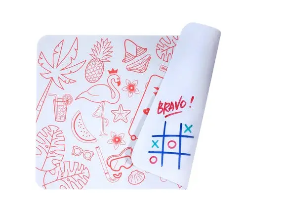 Avec ce mini set de table Florine de chez SUPER PETIT, vos kids pourront dessiner partout ou ils le souhaitent. Ce produit en silicone innovant s’efface au contact de l’eau pour offrir à nouveau une page vierge. 4 feutres effaçables en silicone sont fournis avec le kit..