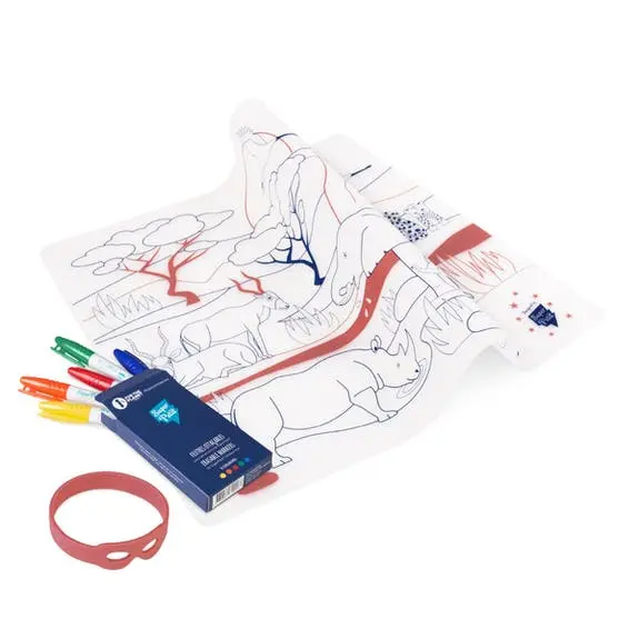 Cet set en silicone de chez SUPER PETIT est votre allié pour faire patienter vos kids à la maison comme à l’extérieur. Il suffit de colorier, d’effacer et de recommencer…autour du thème de la savane … à l’infini. 5 feutres effaçables en silicone sont fournis avec le kit